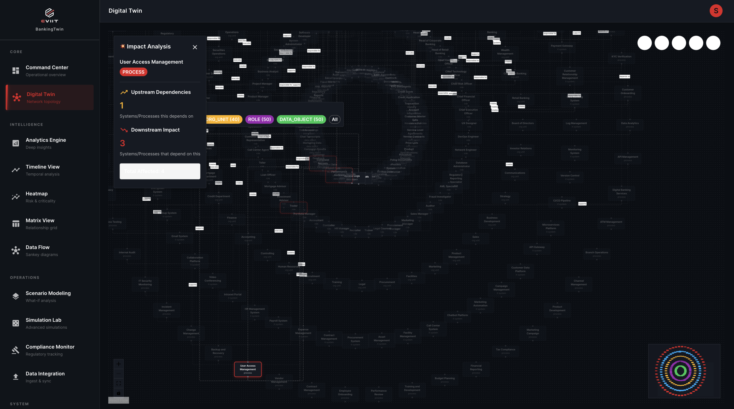 Der BankingTwin von eviit bietet Ihnen einen virtuellen Spiegel Ihrer Bank. Er bildet Ihre gesamte Organisation, von den Geschäftsprozessen über die IT-Systeme bis hin zu Mitarbeitern und Kompetenzen, in einem zentralen, dynamischen Modell ab. So gewinnen Sie wertvolle Einblicke, identifizieren Optimierungspotenziale und treffen fundierte, strategische Entscheidungen.